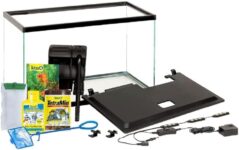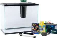 Starter kit includes a 6.6-gallon glass aquarium, plastic hood, LED lighting, internal filter with cartridge, thermometer, water conditioner, fish food sample, and setup guide.